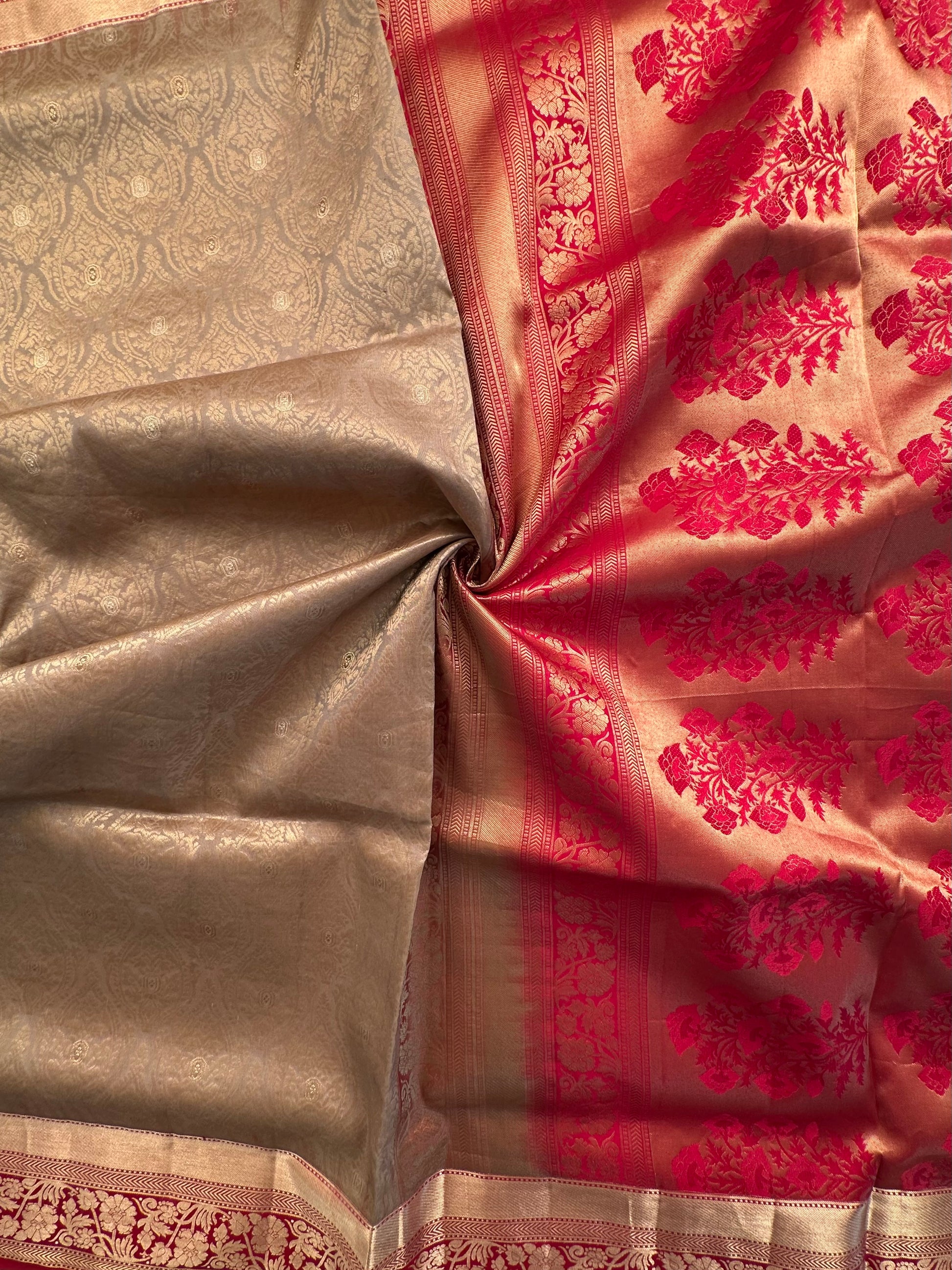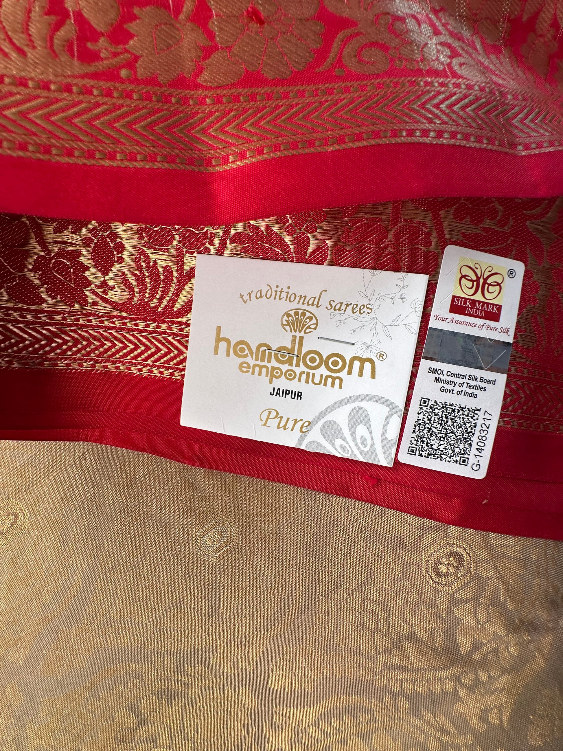 Beige-Red Handloom Kanjivaram Jamawar Pure Silk Saree