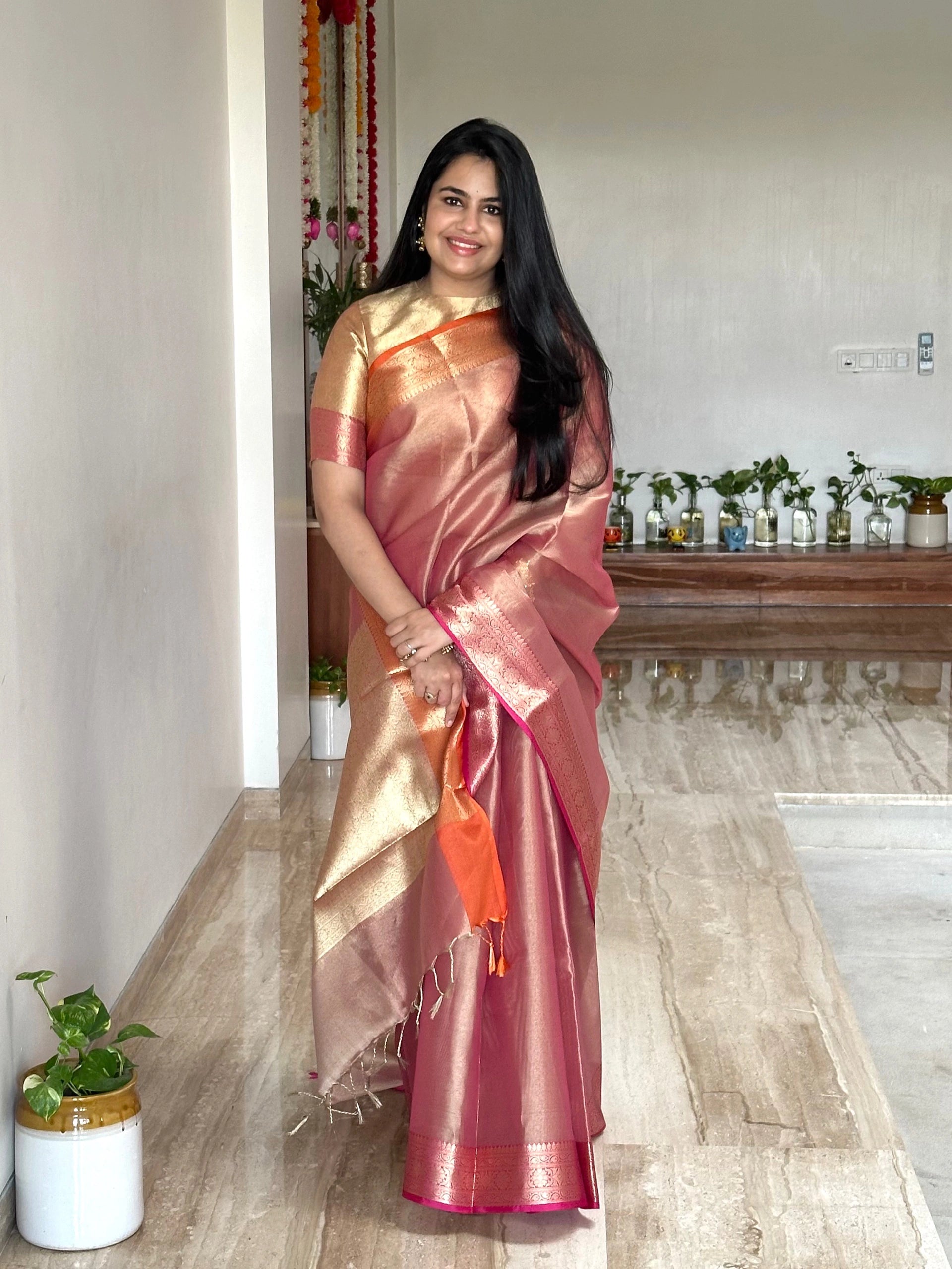Style: Solid Tissue Saree with Zari Border and Contrast Blouse