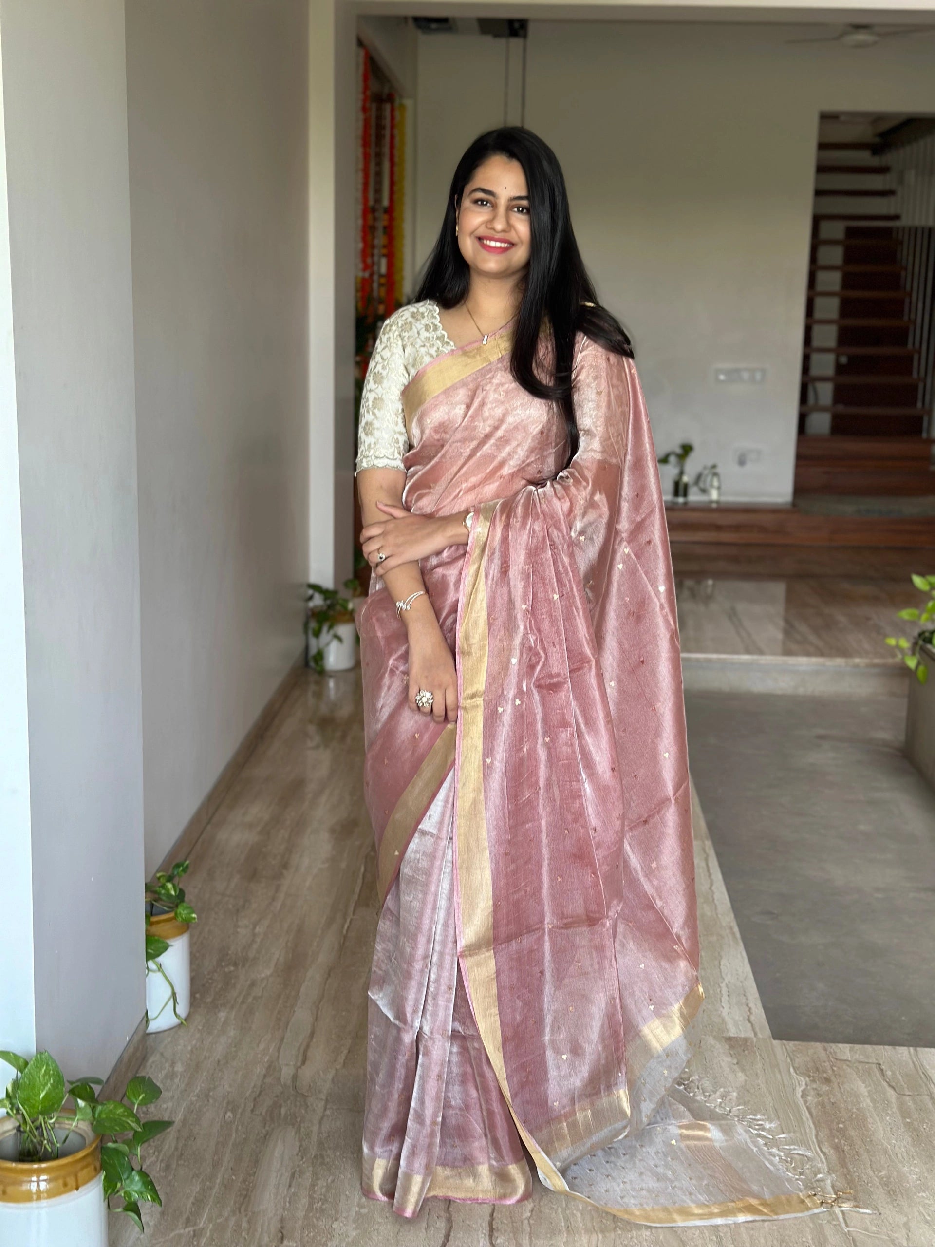 Dusky Pink-Silver Pure Tissue Silk Saree