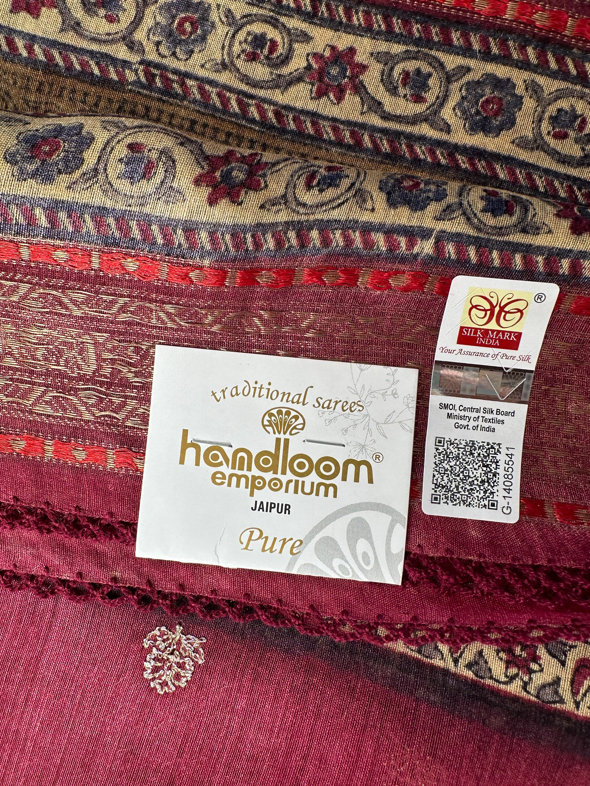Style: Block Printed Saree on the Border, Palla and Blouse with Zari Buti on the body