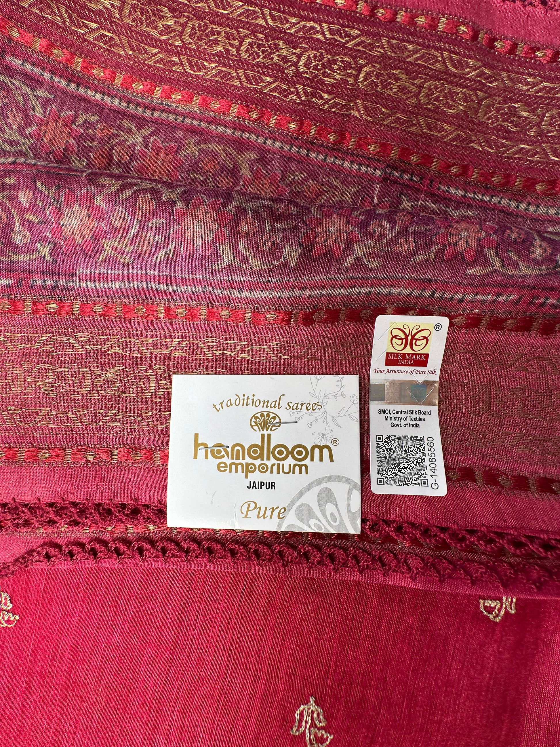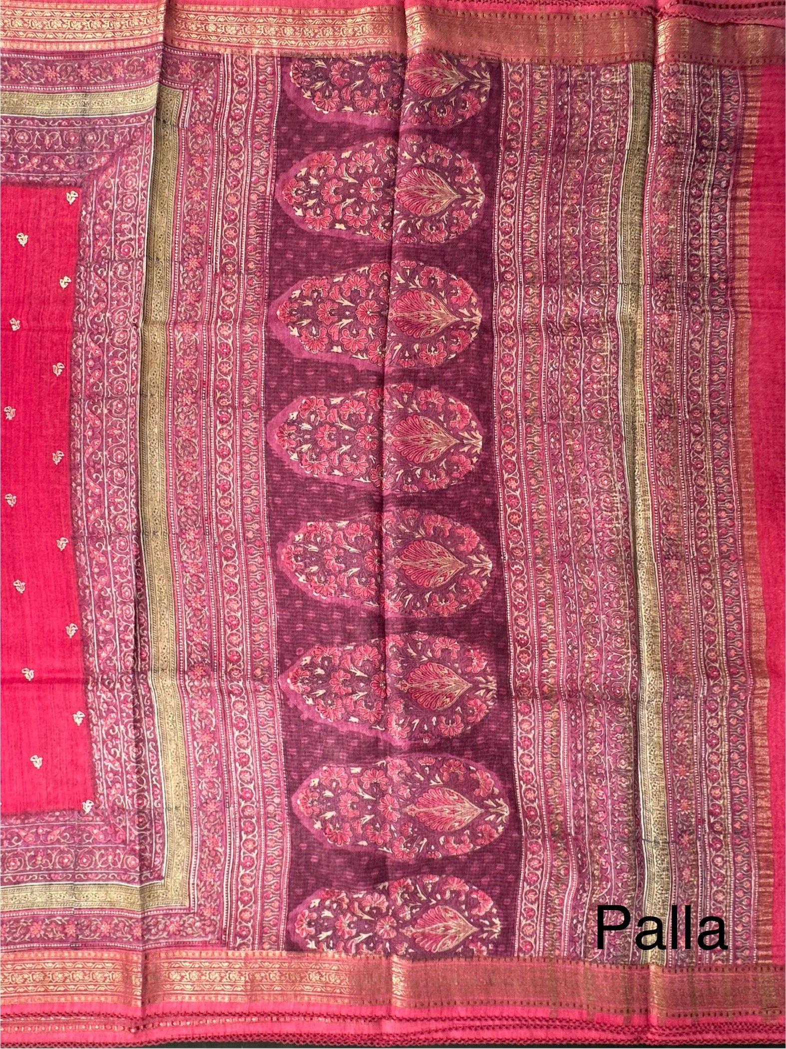 Style: Block Printed Saree on the Border, Palla and Blouse with Zari Buti on the body