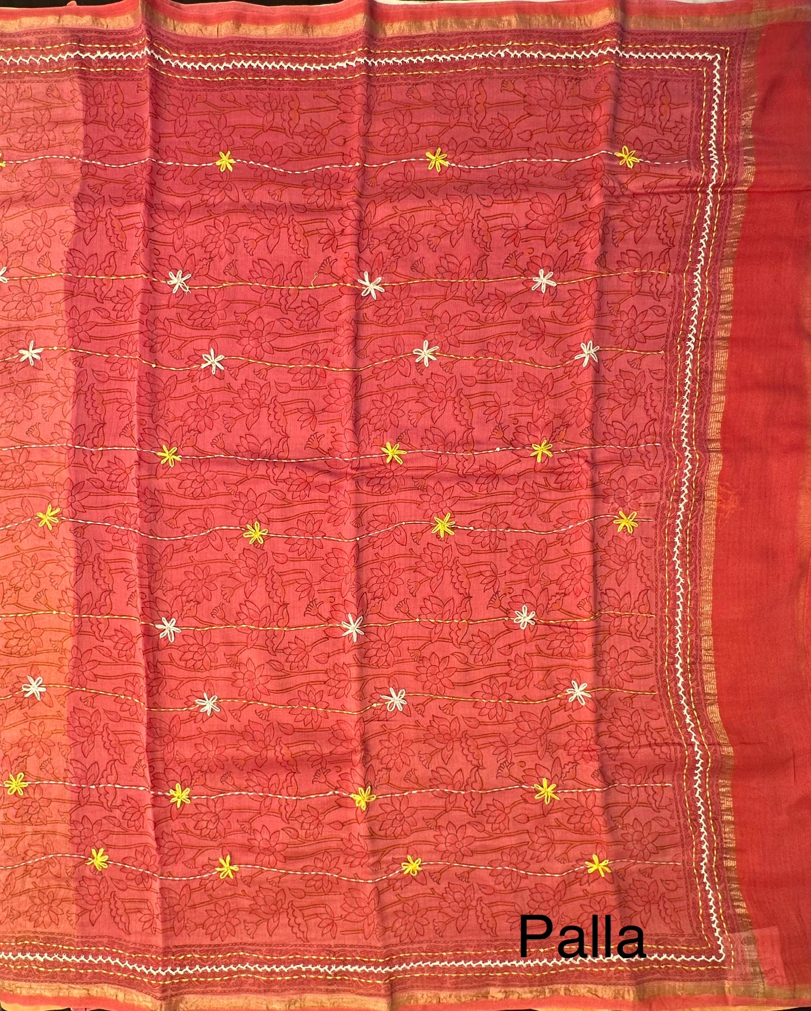 Yellow-Red Block Print Chanderi Saree With Kaantha Stitch